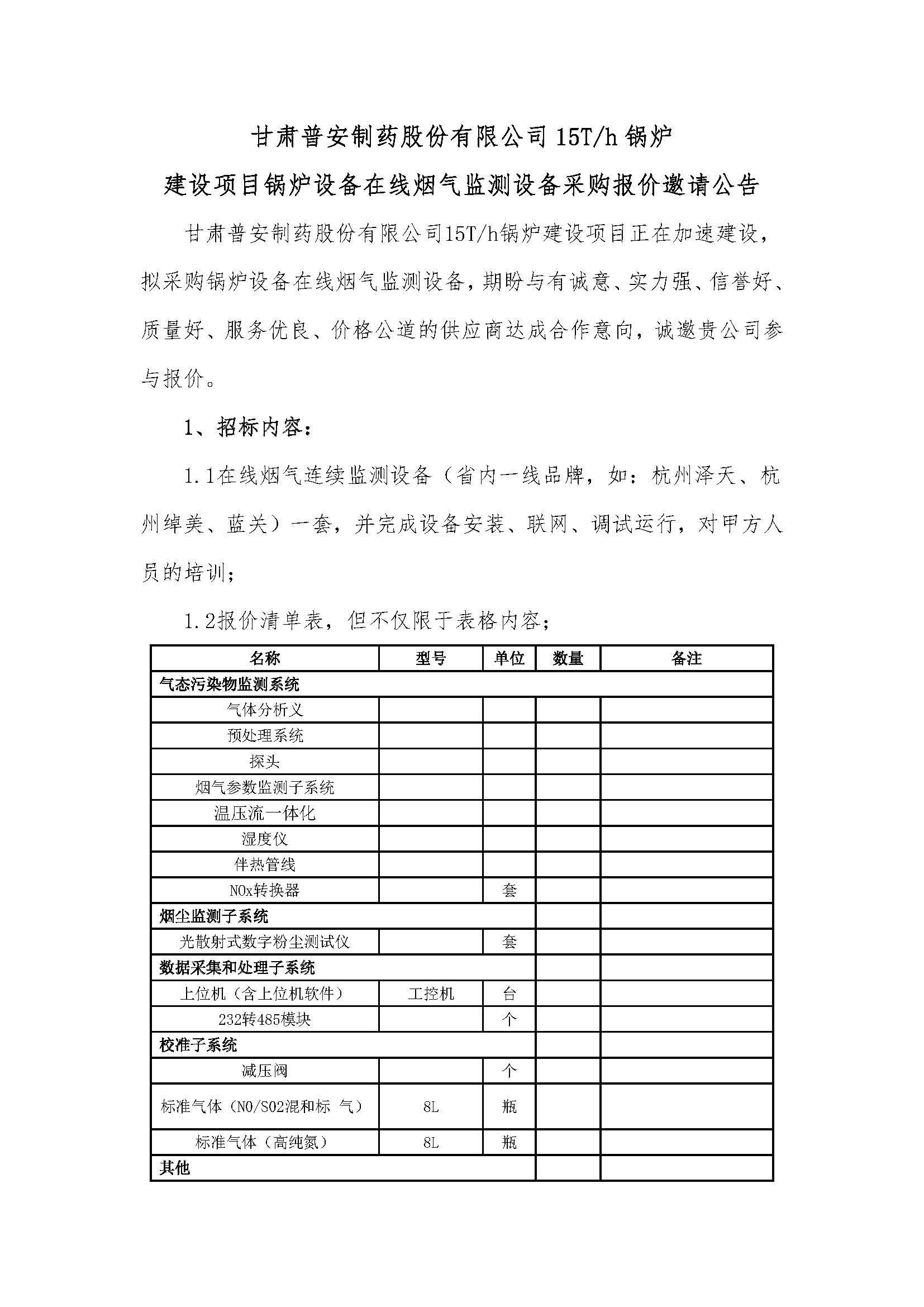 甘肅普安制藥股份有限公司15T/h鍋爐建設(shè)項(xiàng)目鍋爐設(shè)備在線煙氣監(jiān)測(cè)設(shè)備采購(gòu)報(bào)價(jià)邀請(qǐng)公告