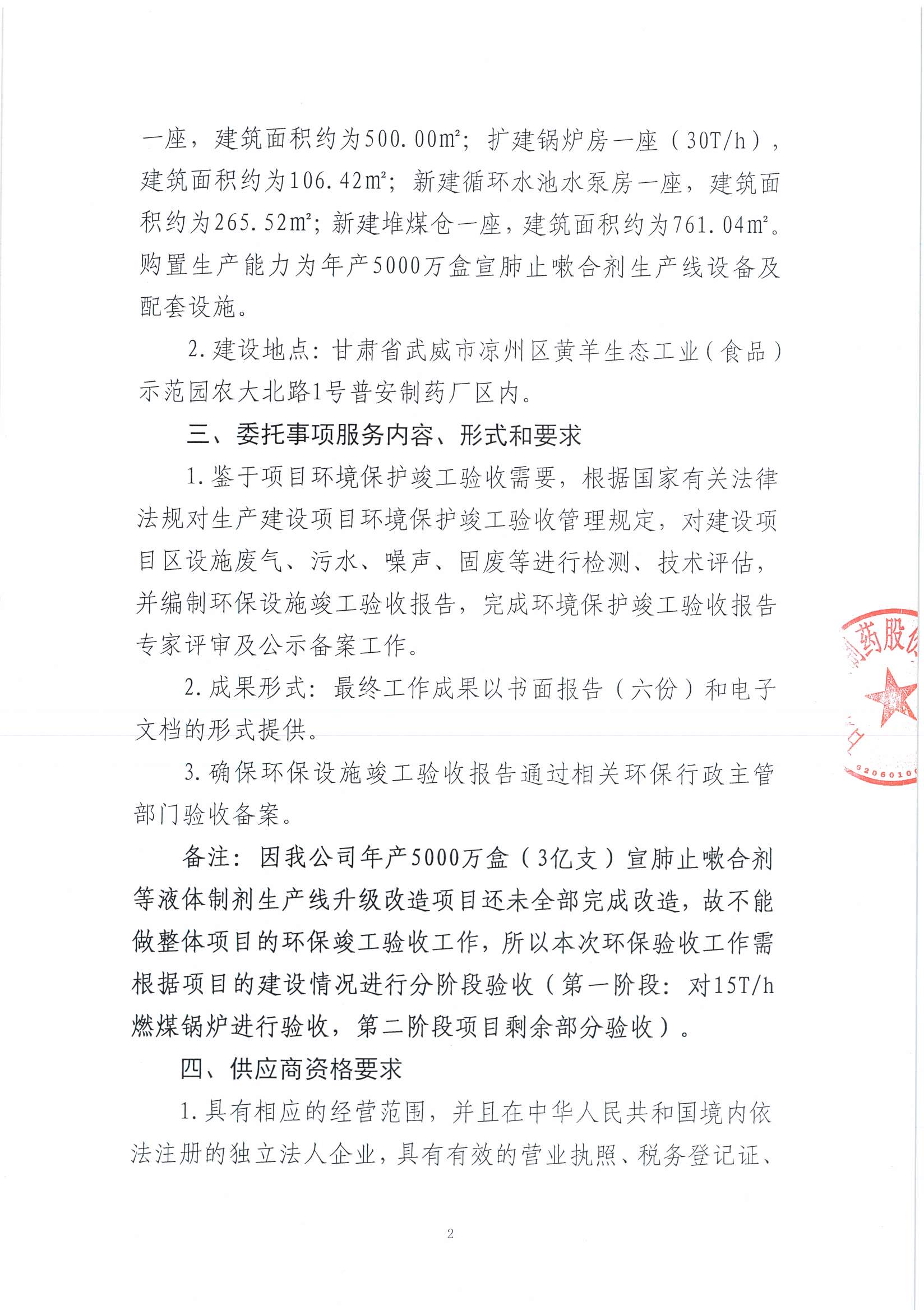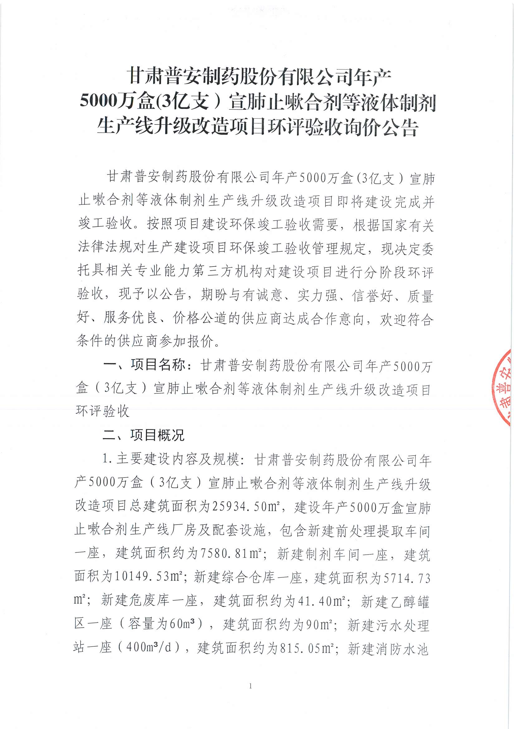 甘肅普安制藥股份有限公司年產(chǎn)5000萬(wàn)盒(3億支)宣肺止嗽合劑等液體制劑生產(chǎn)線升級(jí)改造項(xiàng)目環(huán)評(píng)驗(yàn)收詢價(jià)公告