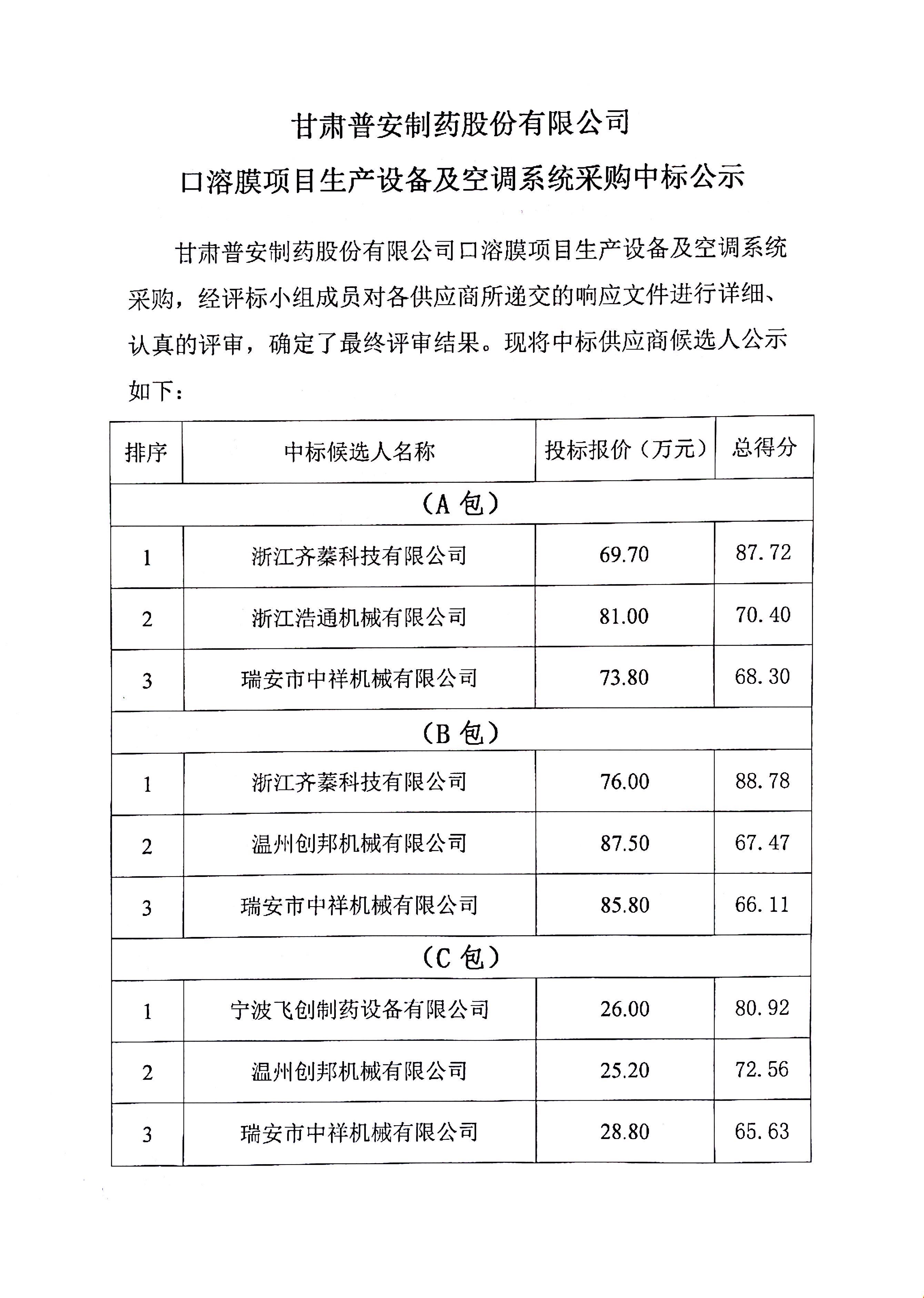 甘肅普安制藥股份有限公司口溶膜項目生產設備及空調系統(tǒng)采購中標公示