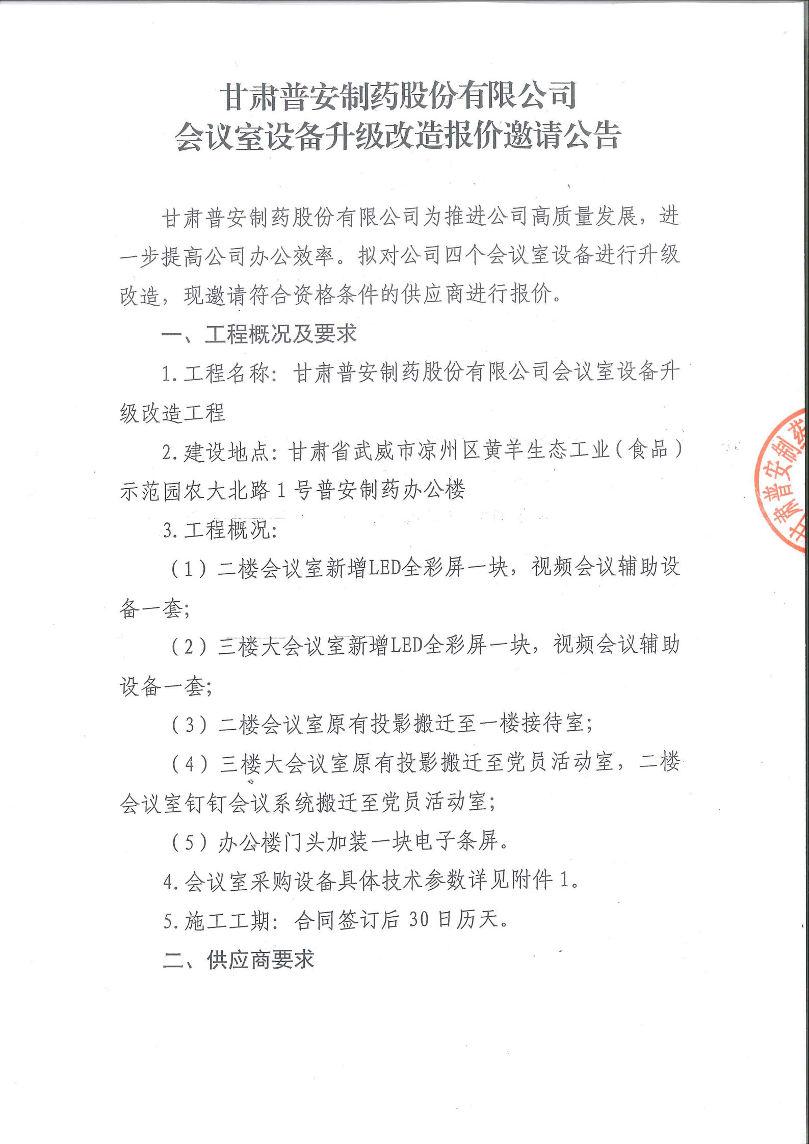 甘肅普安制藥股份有限公司會議室設備升級改造報價邀請公告