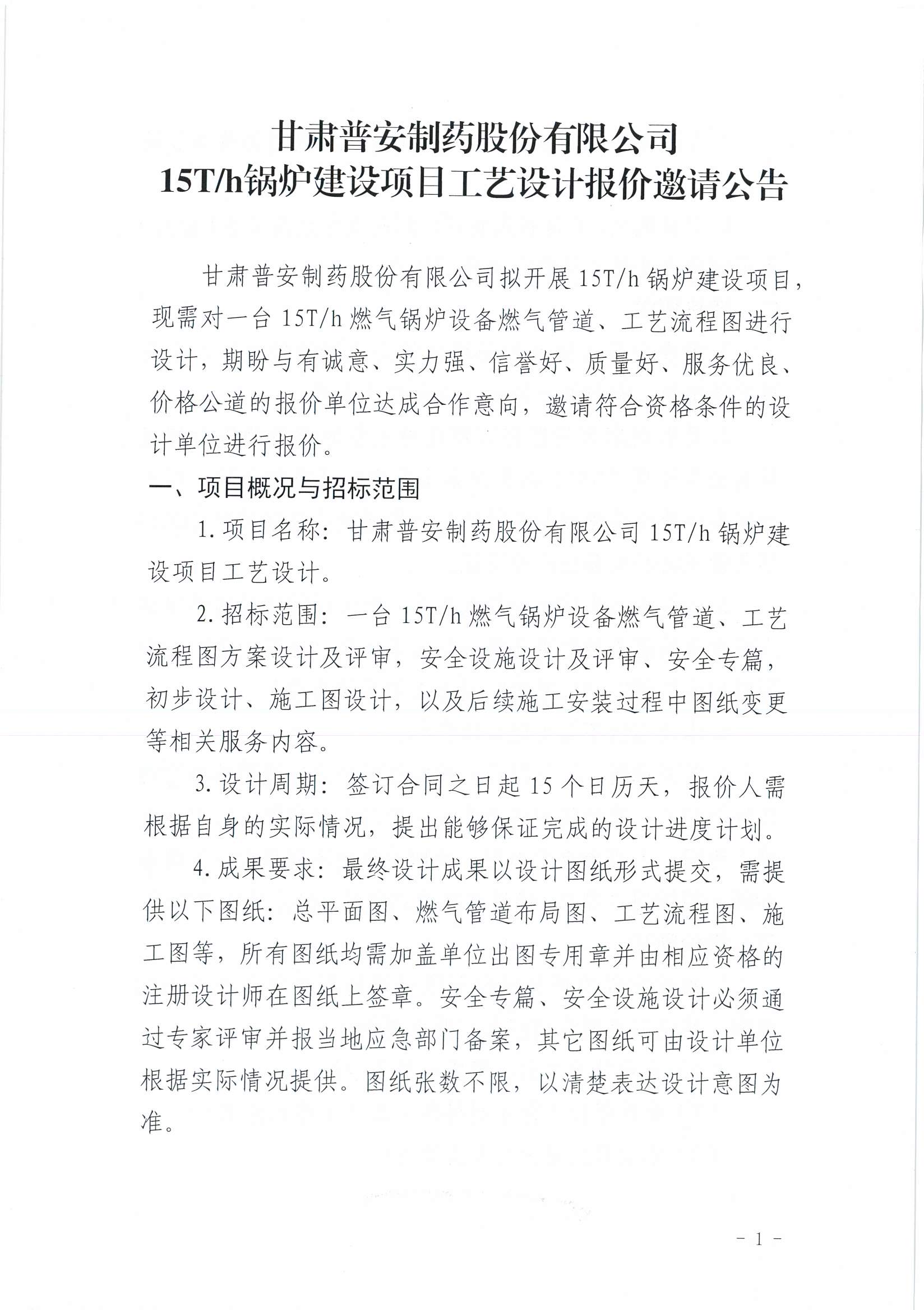 甘肅普安制藥股份有限公司15T/h鍋爐建設項目工藝設計報價邀請公告
