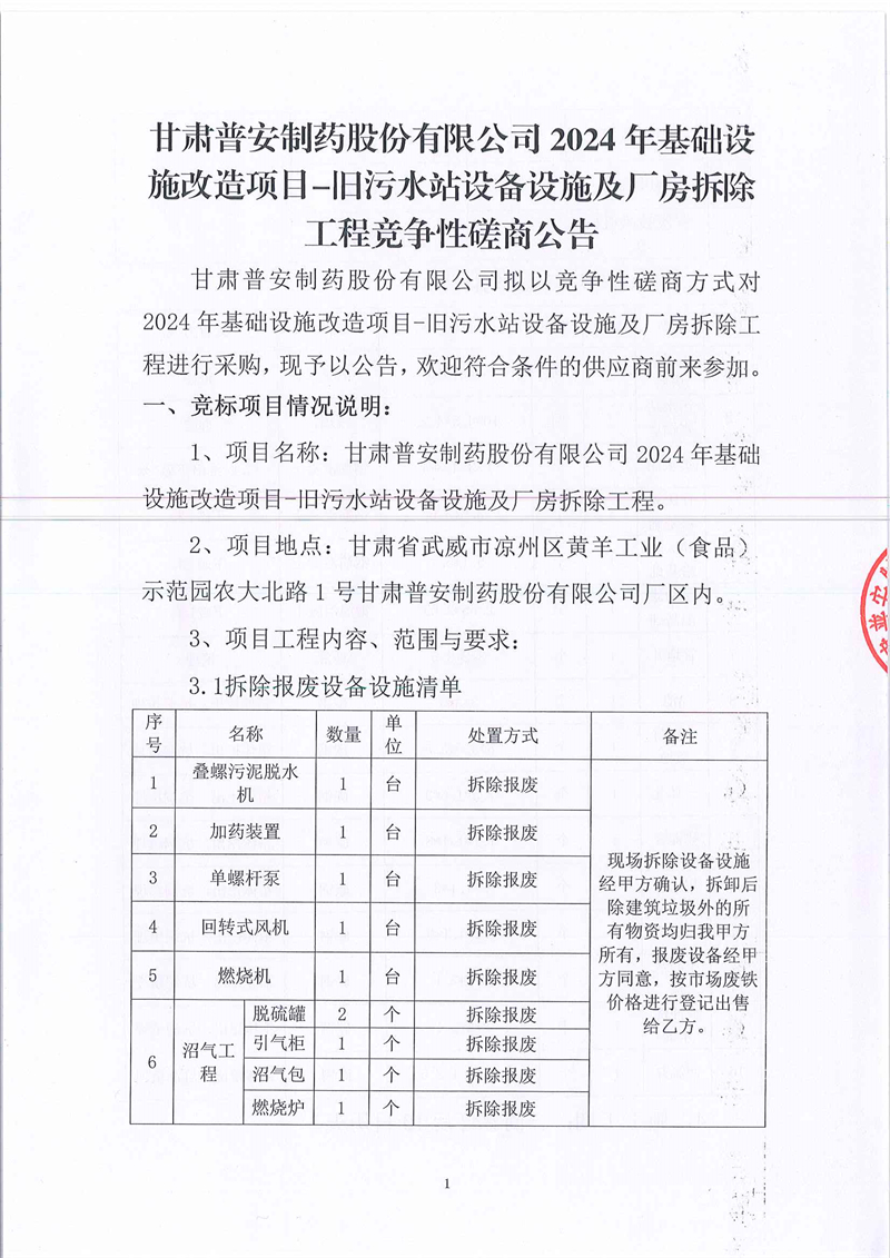 甘肅普安制藥股份有限公司2024年基礎設施改造項目-舊污水站設備設施及廠房拆除工程競爭性磋商公告