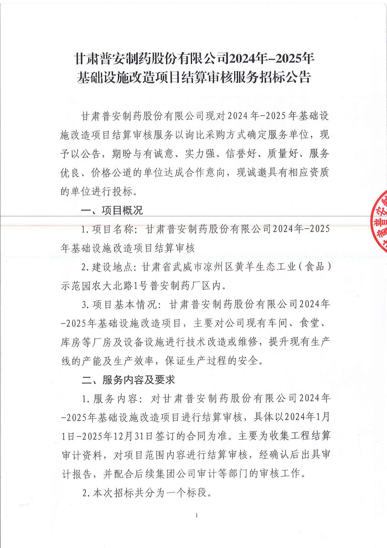 甘肅普安制藥股份有限公司2024年-2025年基礎(chǔ)設(shè)施改造項(xiàng)目結(jié)算審核服務(wù)招標(biāo)公告