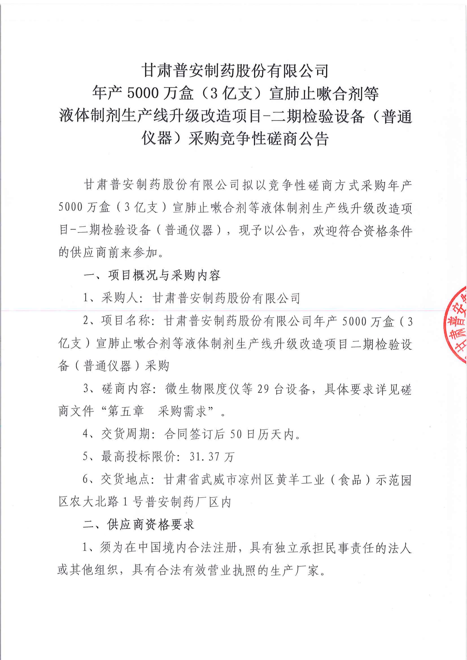 甘肅普安制藥股份有限公司年產5000萬盒(3億支)宣肺止嗽合劑等液體制劑生產線升級改造項目二期檢驗設備(普通儀器)采購競爭性磋商公告