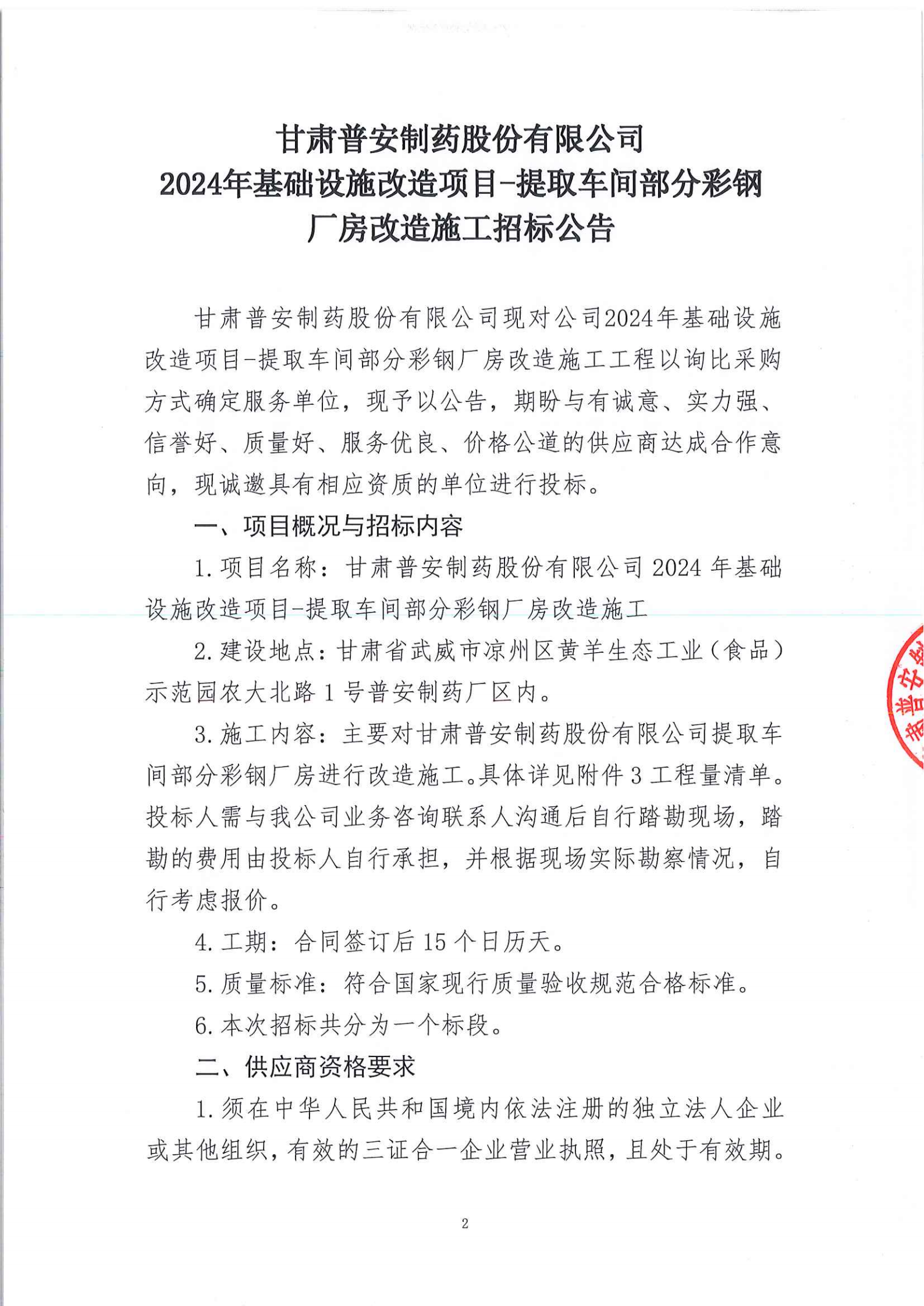 甘肅普安制藥股份有限公司2024年基礎(chǔ)設(shè)施改造項目-提取車間部分彩鋼廠房改造施工招標公告