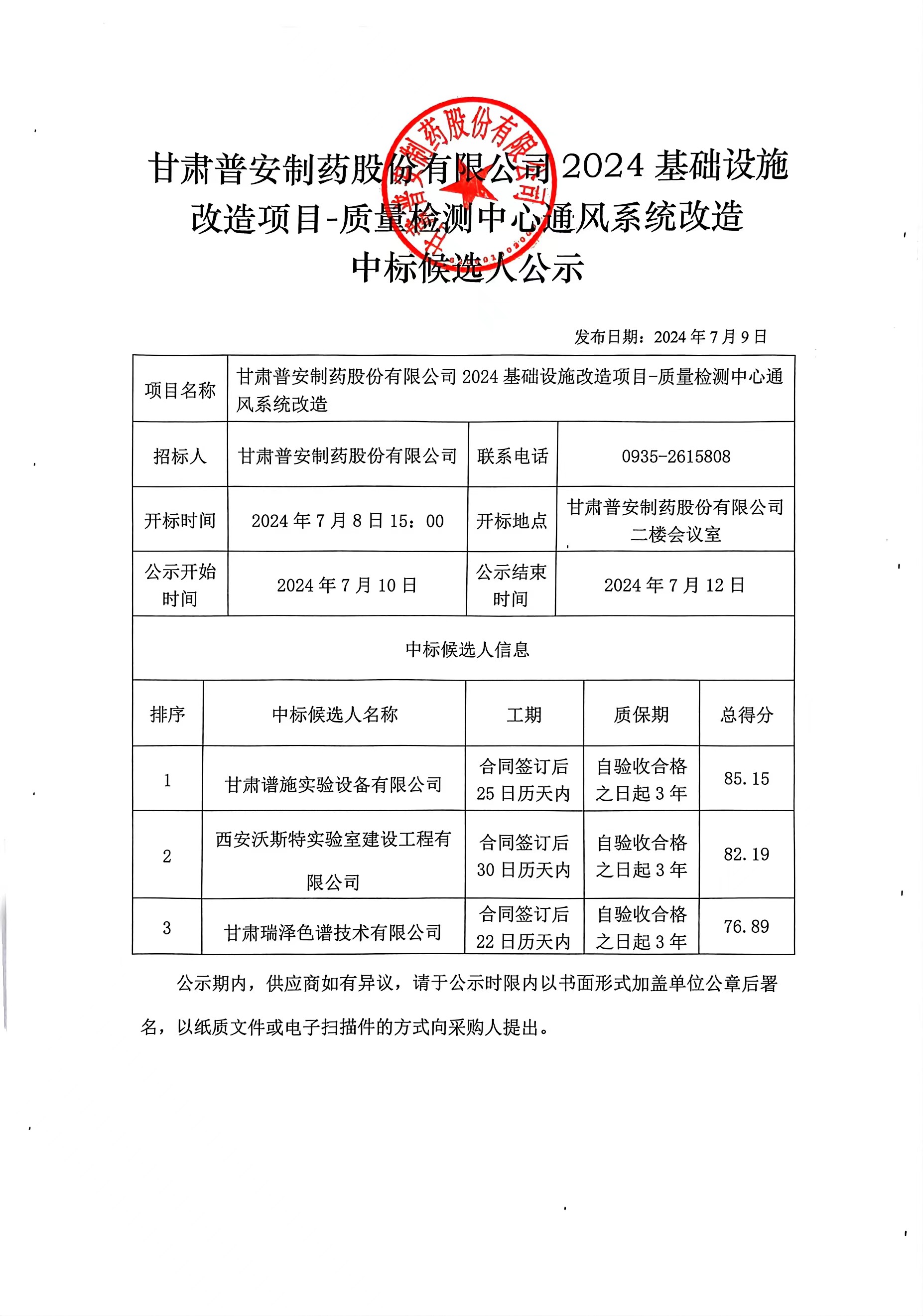 甘肅普安制藥股份有限公司2024年基礎(chǔ)設(shè)施改造項(xiàng)目-質(zhì)量檢測(cè)中心通風(fēng)系統(tǒng)改造中標(biāo)候選人公示