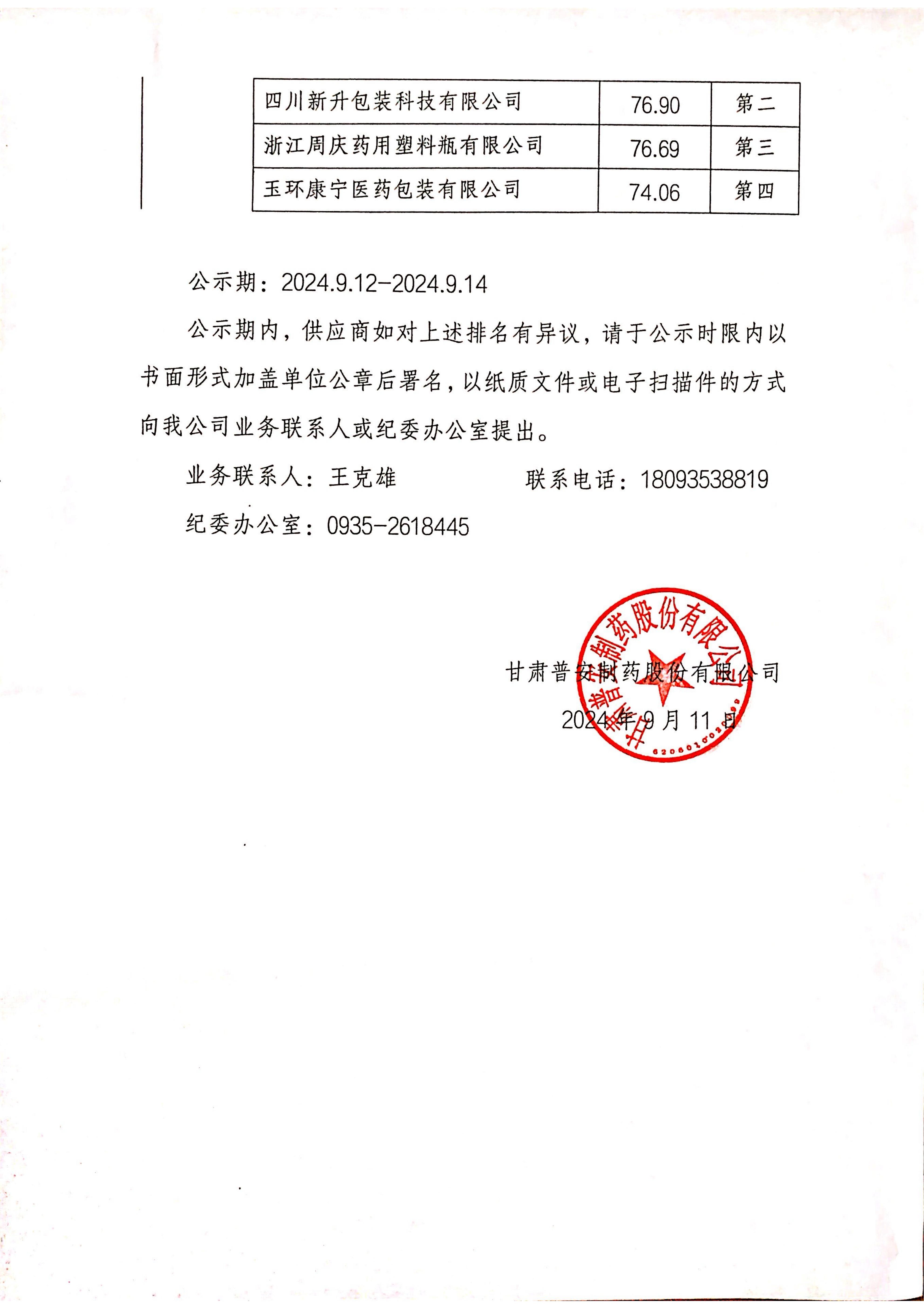 甘肅普安制藥股份有限公司2024年8月1000萬盒宣肺止嗽合劑包裝材料補充招標采購結果公示