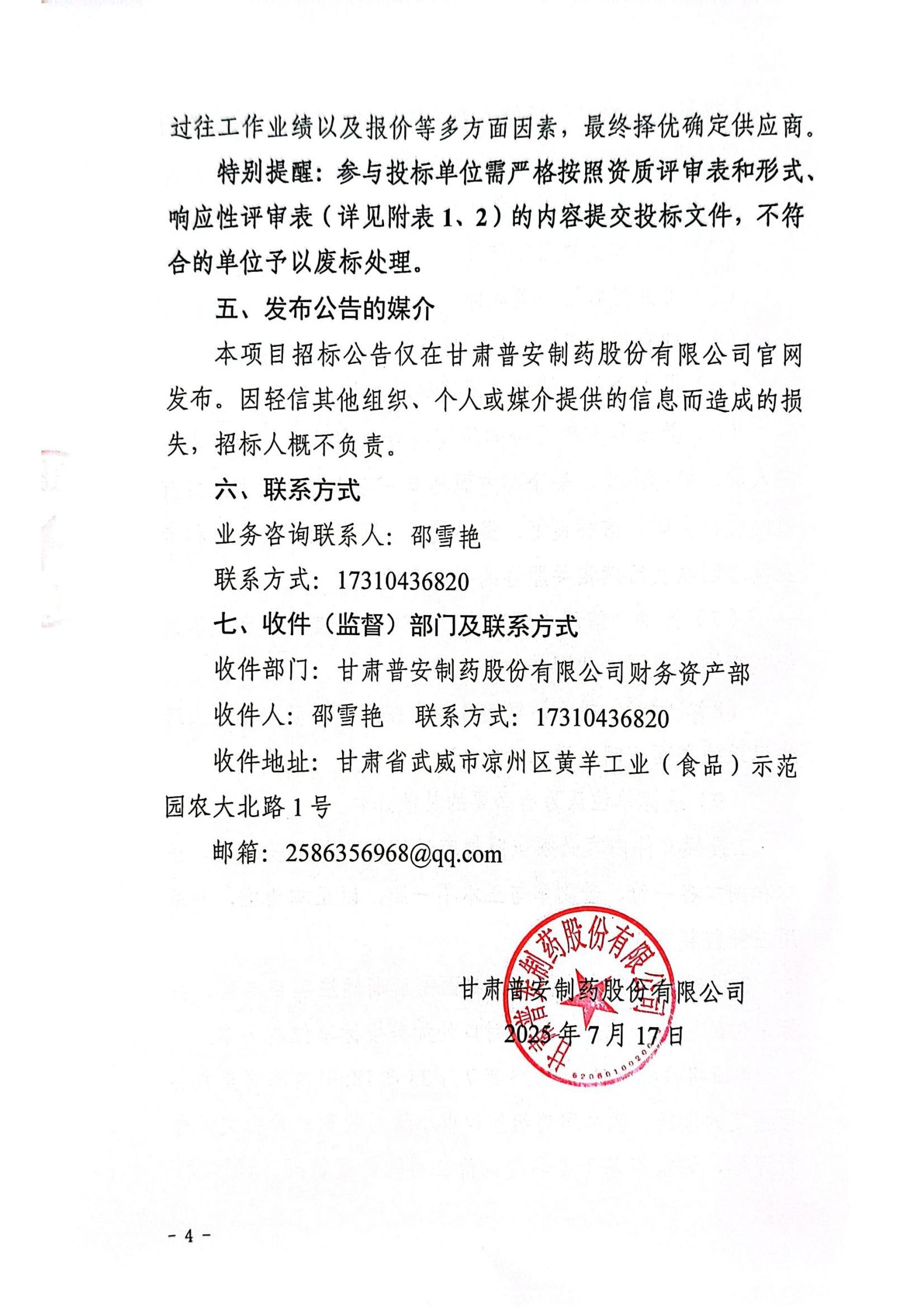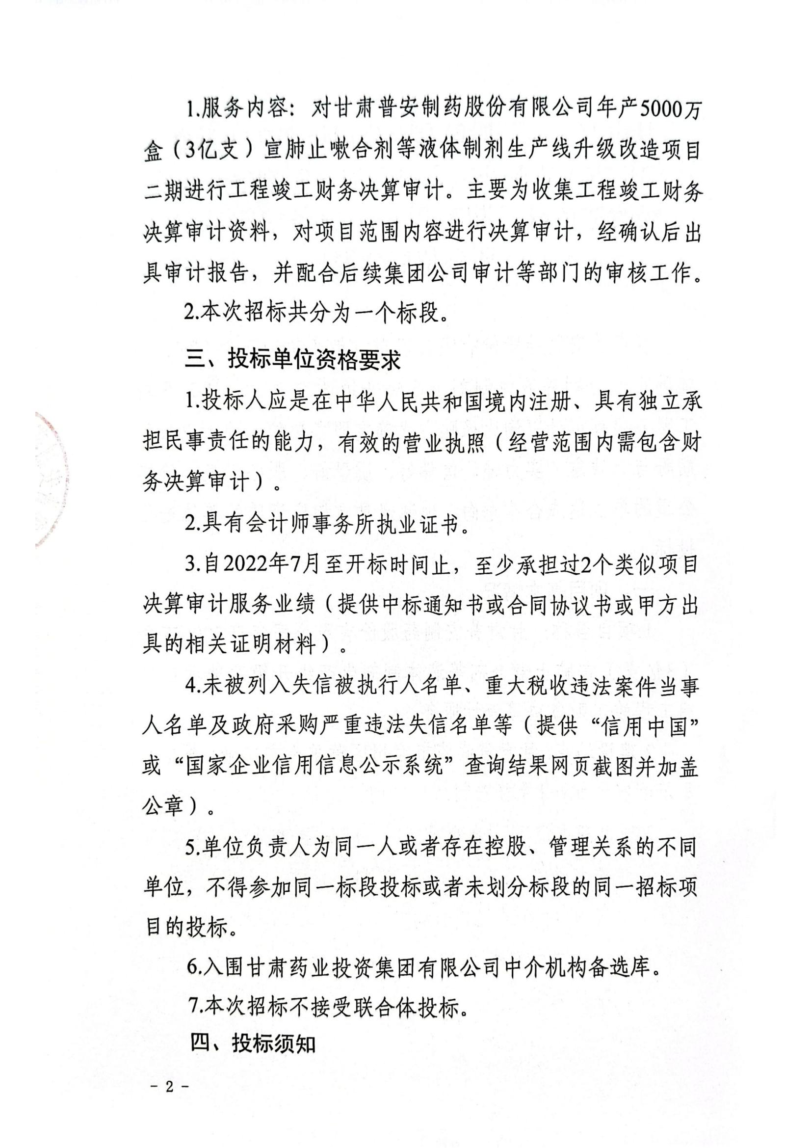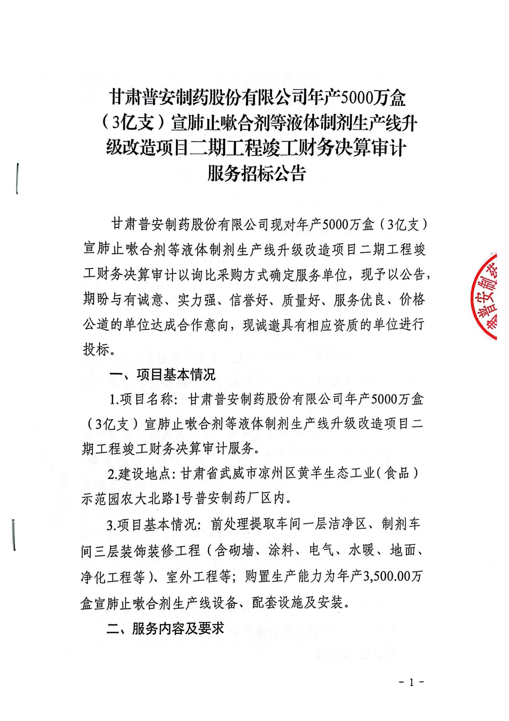 甘肅普安制藥股份有限公司年產5000萬盒宣肺止嗽合劑等液體制劑生產線升級改造項目二期竣工決算審計服務招標公告