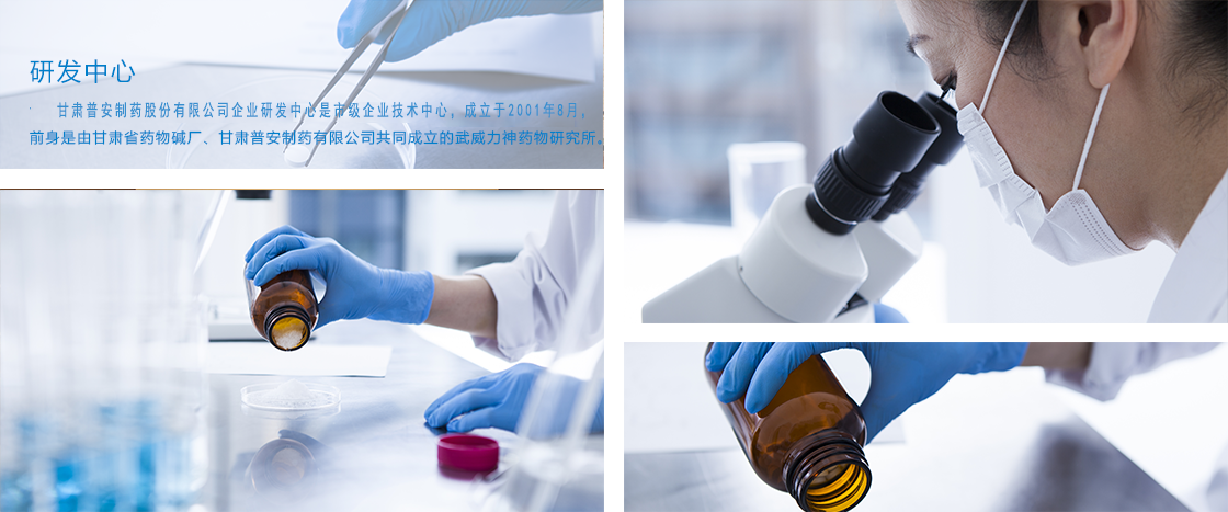 甘肅普安制藥股份有限公司企業研發中心是市級企業技術中心,成立于2001年8月,前身是由甘肅省藥物堿廠、甘肅普安制藥有限公司共同成立的武威力神藥物研究所。經過不斷的發展,研發中心已經成為集信息收集與分析、技術創新、新產品研發、中試生產于一體的研發體系。